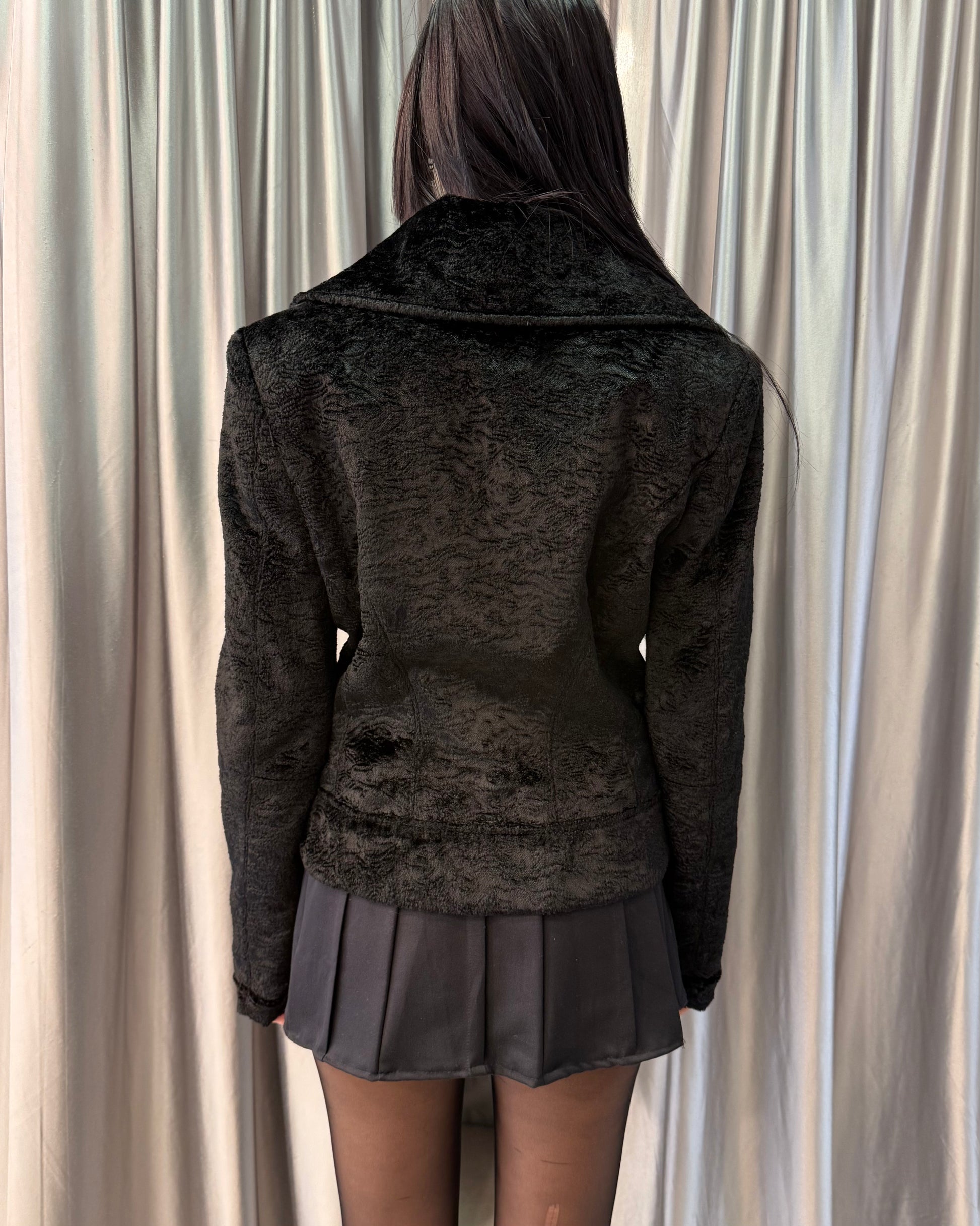 Black textured double-breasted jacket crafted from a soft, plush fabric with a subtle patterned finish. Designed with wide notch lapels, structured shoulders, and a slightly cropped fit for a polished, modern silhouette.