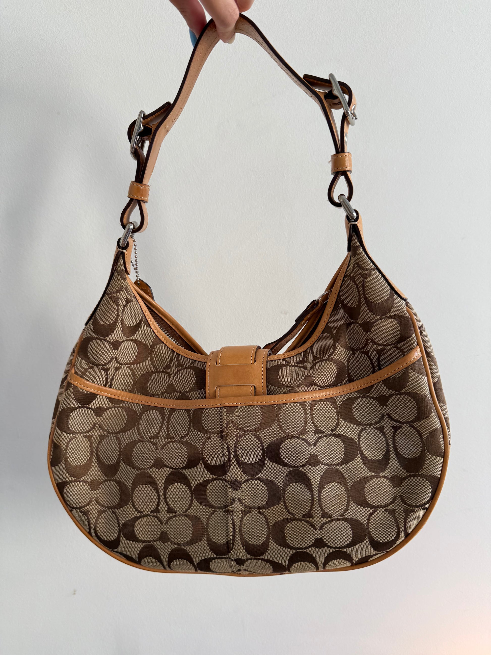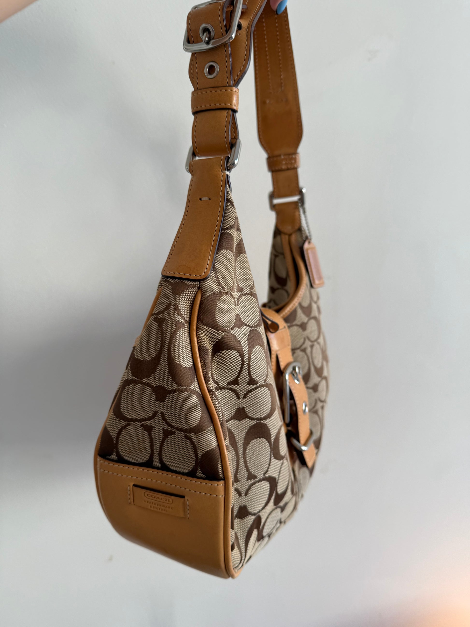Vintage Coach shoulder bag featuring the signature monogram canvas in warm brown tones with tan leather trim. Designed in a classic hobo silhouette with a front buckle accent, top zip closure, and single adjustable strap for shoulder carry.