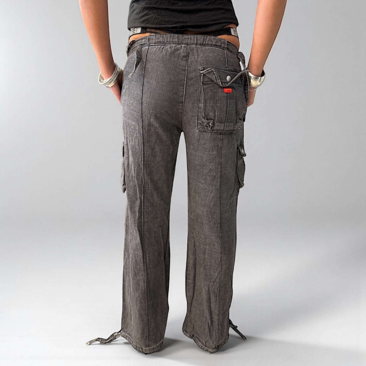 Washed grey cargo pants crafted from soft, lightweight cotton-blend fabric. Designed with a low-rise waist, zip and button closure, and a relaxed wide-leg silhouette. Features side and back cargo pockets, zipper details along the legs, and adjustable drawstring hems for a structured yet effortless look.