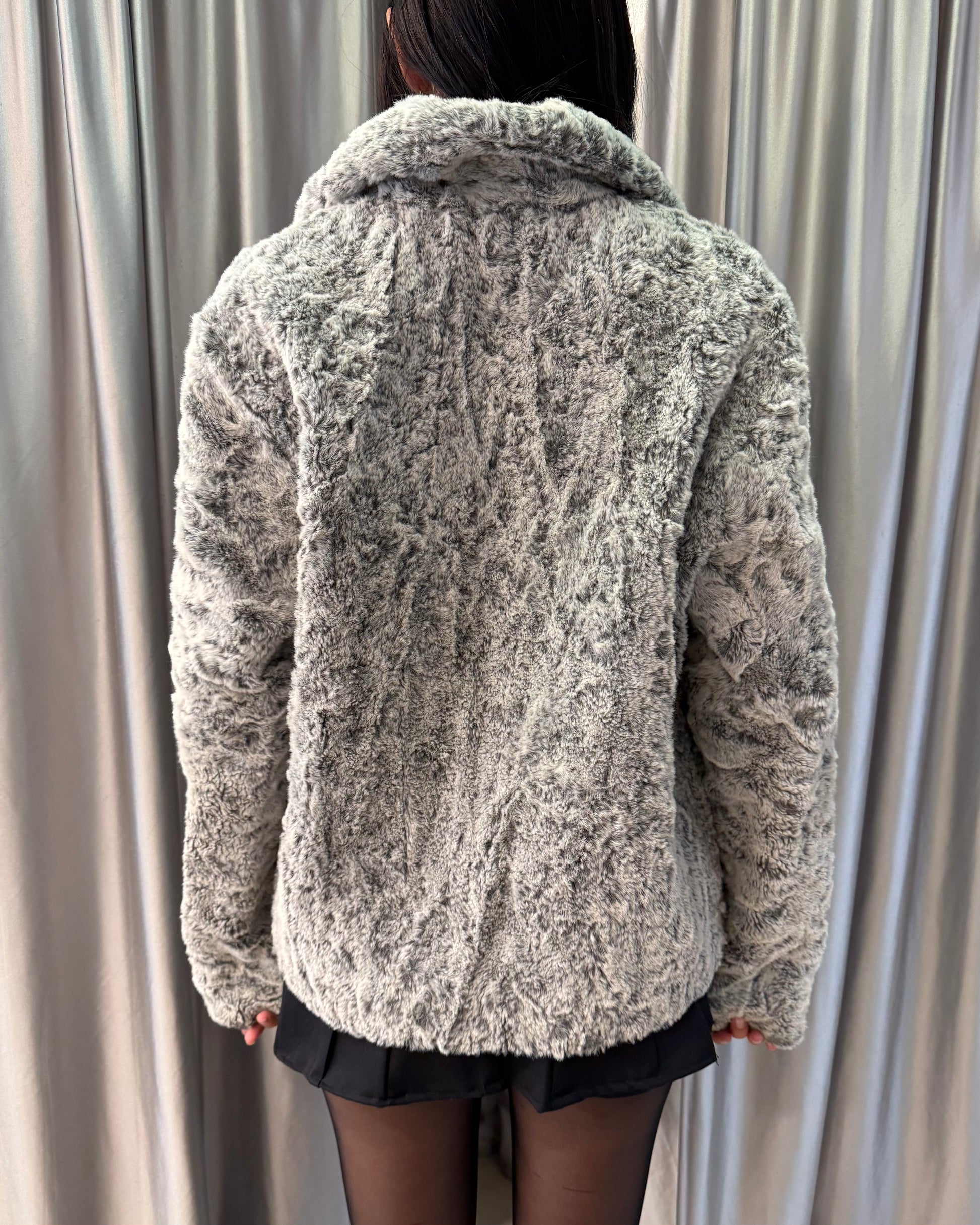 Soft grey faux-fur jacket featuring a plush, textured finish and a relaxed silhouette. Designed with a fold-over collar and a cozy feel, offering both warmth and a chic statement look.