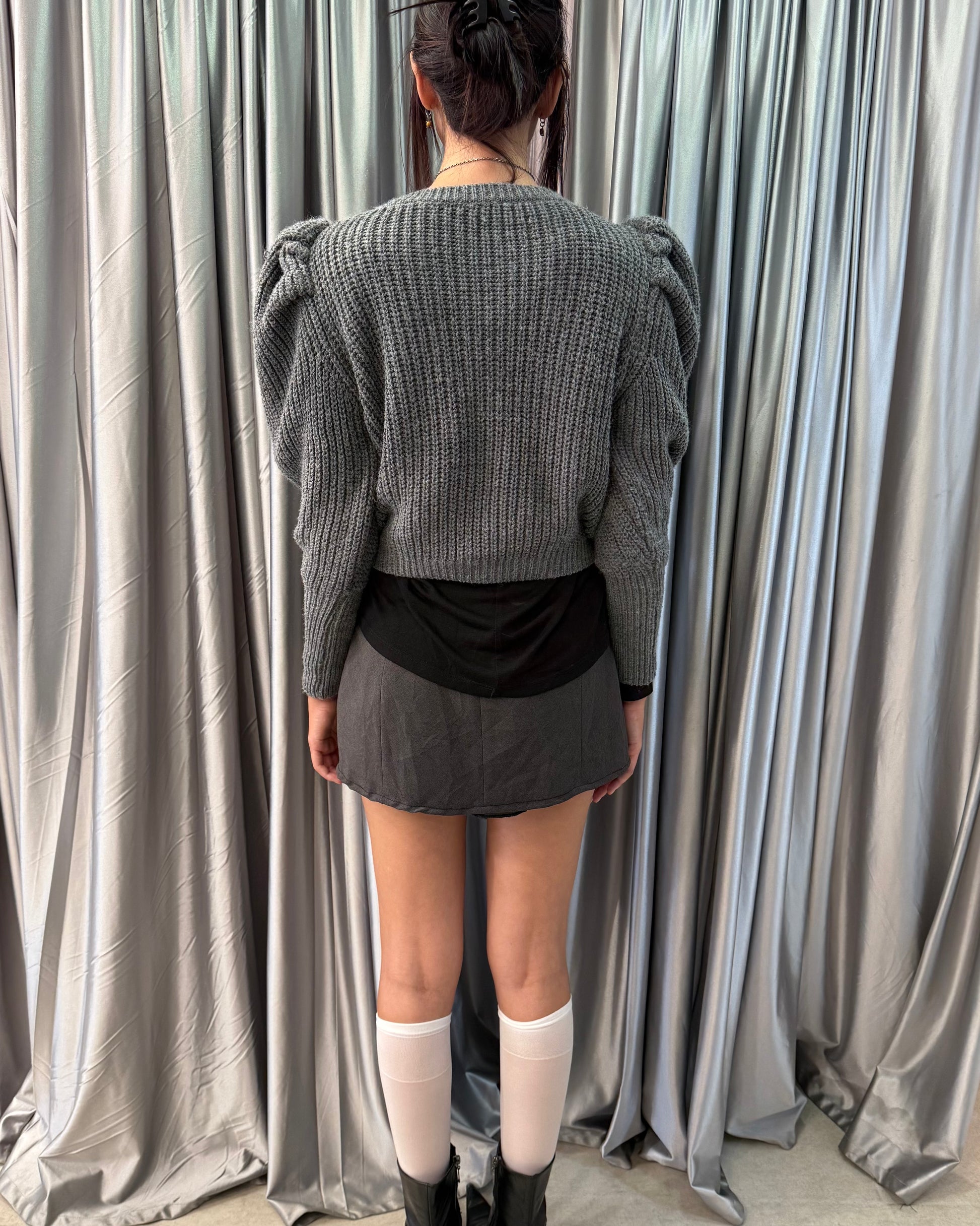 Chunky grey knit sweater featuring textured cable detailing and dramatic puffed sleeves. Designed with a slightly cropped silhouette and fitted ribbed cuffs for a structured, elegant shape that elevates a classic knit.