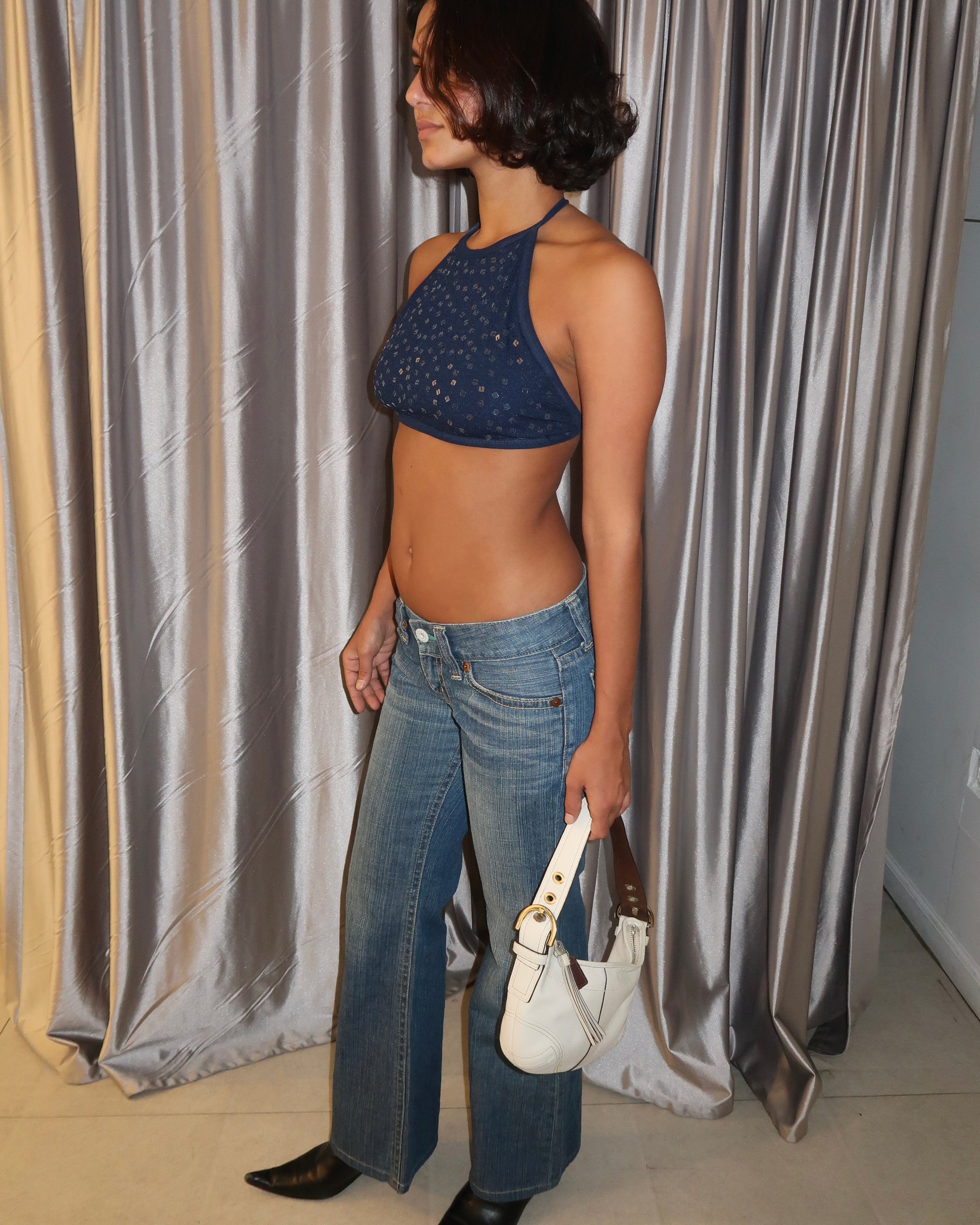 Navy halter-style crop top crafted from a soft cotton-blend knit with subtle sequin accents throughout. Features a high neckline, open back, and a fitted silhouette for a sleek, minimal look with a touch of sparkle.